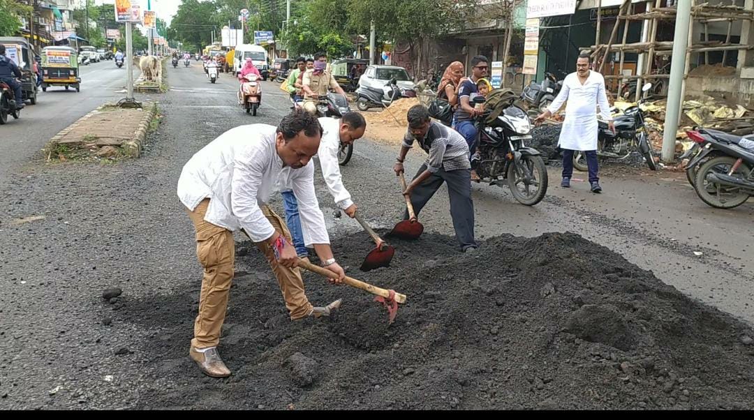 समाज सेवक भूषण फुसे यांचे अनोखे आंदोलन, रस्त्यावरील खड्डे बुजवून मनपाची पोल खोल