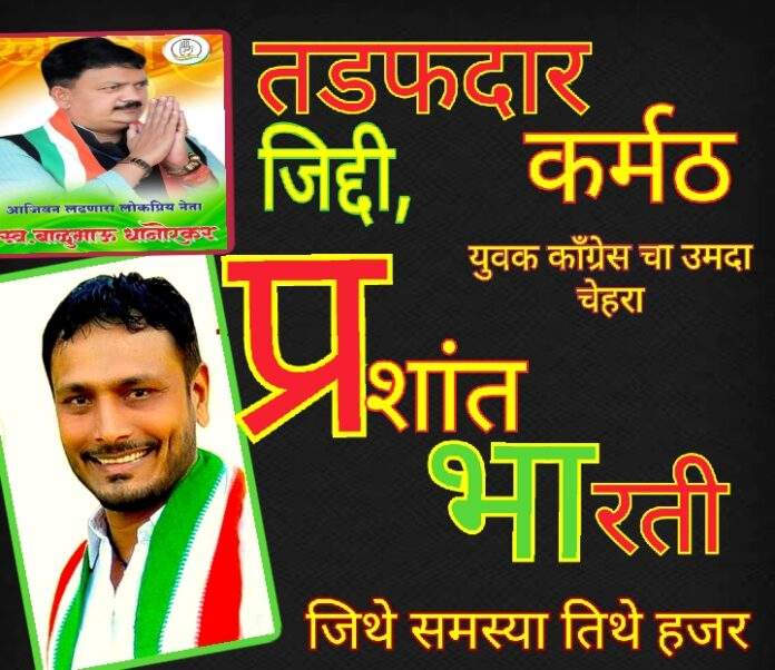 समाजातील समसेच्या प्रश्नाला,कर्तव्य पूर्ण कार्यक्षमता ठेव्हत त्या आव्हानाला ठसनी नी आंदोलनाच्या माध्यमातून सडेतोड उत्तर विचारणारा आणि जागेवर काम करून घेणाऱ्या युवक काँग्रेस चा एक दमदार चेहरा म्हणजे प्रशांत भारती नावाचा तरून सध्या आपल्या कामाच्या कर्तृत्वाने ओळखल्या जात आहे.