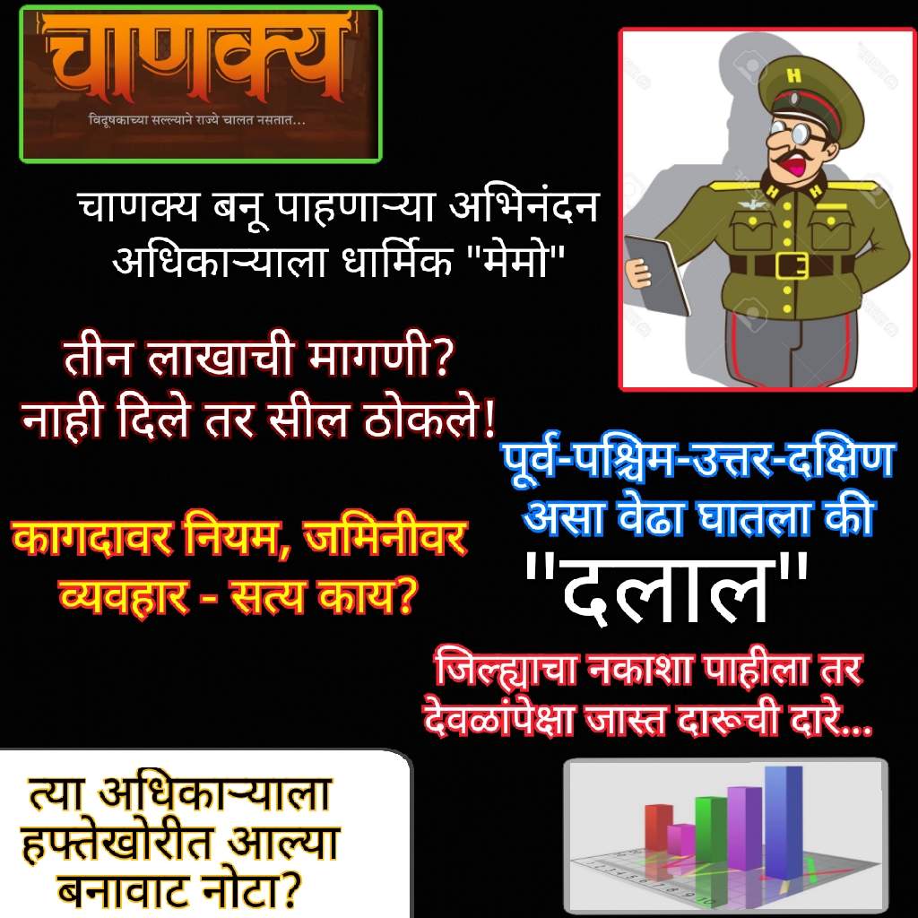 भ्रष्टाचाराच्या कितीतरी अध्यायाने हफ्ते वसुलीचे जंजीर बनलेले राज्य उत्पादन शुल्क विभागातील लाचखोर, चाणक्य बनण्याच्या नादात आहे, पण चाणक्य नीती त अडकलेल्या या अधिकाऱ्याला मेमो आला आहे. लवकरच आणखी मोठ्या कारवाईचा बिगुल वाजणार असल्याचे सूत्रांनी माहिती दिली आहे.